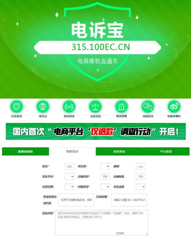 若您遭遇恶意、虚假评测,或被网络“黑嘴”敲诈勒索,可向我们提供线索,电诉宝将持续为商家、企业发声。如2024年7月23日,网络消费纠纷调节平台“电诉宝”联合网经社电子商务研究中心发起“电商平台‘仅退款’调查行动”,并得到社会各界的关注。8月1日,网络消费纠纷调解平台“电诉宝”上线国内首个电商商家“仅退款”第三方投诉通道。该投诉通道旨在平衡消费者与商家之间的权益,为商家提供一个公正的维权渠道,并移交平台进行二次审核,减少错判误判,以应对日益增多的“仅退款”争议。