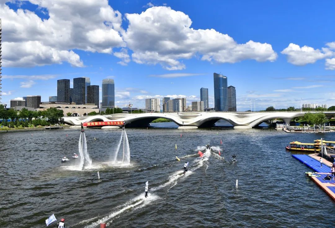 运河开漕节、灯光秀,持续擦亮“大运河文化游”品牌,冲浪、皮划艇、龙舟赛等体育活动更是给古老的运河增添了现代活力,大运河音乐节、运河马拉松等活动让“走大运”成为都市人的生活新方式。无论是在公园锻炼的市民,还是运河泛舟畅游的游客,正享受着京津冀协同发展给生活带来的实实在在的改变,运河串联起古今新业态下的生活新模式。北运河两岸“一轴、两带、两山、十三节点”的旖旎风光及河道水生态治理成果铺开一幅“蓝绿交织、水城共融”的生态画卷。
