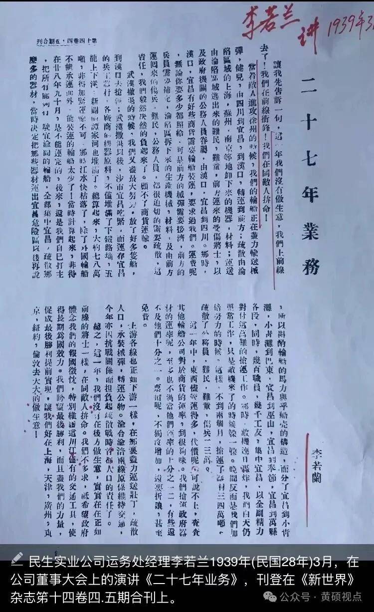1939年3月20日,运务处经理李若兰代表各科室在股东大会上演讲《二十七年业务》,继后刊登在《新世界》14卷四五期合刊上这段话,真乃惊天地泣鬼神:这一年多来,公司没有做生意,我们上前线去了,在前线冲锋,在同敌人拼命。敌人进攻徐州时,我们轮船正在拼力输送枪炮弹药、壮丁健儿,把大批生力军由重庆安全运到宜昌、汉口前线,把即将沦陷地区卸下来的的机械、材料,难民、受伤将士运回大后方。船员们没有节假、难有休息、夜以继日、救亡图存,眼看着同仁被敌机击中,血染甲板惨烈殉职,无人退却,大家化悲愤为力量,决心前赴后继、确保航线畅通,运送更多将士和弹药到前线,消灭日寇,我们民生人是不拿枪的军队,勇敢无畏的战士。