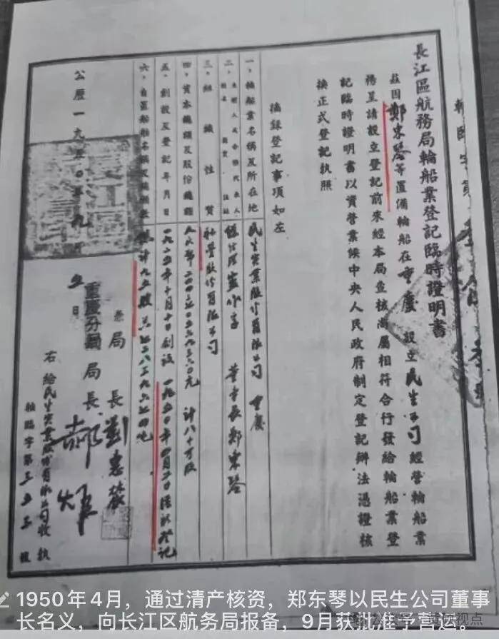 1950年4月,通过清产核资,郑东琴以民生实业公司董事长名义,向长江区航务局报备,减除战争损失和落后的旧船淘汰,实际拥有船舶95艘,近8万载重吨,经审核确定9月正式获批准予营运。在以郑东琴为首的董事会坚强领导、正确决策下,民生实业公司不仅成功地保全了资产,还迎来了新的发展机遇。随着新中国成立后的社会稳定、经济恢复,民生实业公司在中央、西南局和重庆市人民政府的大力支持下,公司运营迅速走上正轨,进一步拓展了航运等业务。郑东琴董事长带领公司管理层,审时度势,制定了长远的发展规划,不仅着眼于国内市场的拓展,还积极寻求国际合作与交流和营运。
