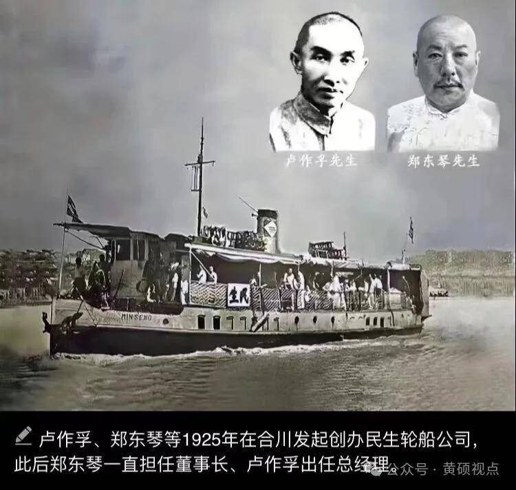 1925年10月11日,一批“志同道合者”,在合川岳王庙民众教育馆召开民生轮船公司发起人会议,一致决定挤进“黄金航道”以“服务社会、便利人群、开发产业、富强国家”为宗旨,干一番事业,逐步改变“洋船”肆无忌惮横行川江的局面。卢作孚出任筹委会主任,郑东琴不仅倾囊积存、抵押田产、典当夫人陪嫁,凭借自已的人脉名望出资和找钱,名儒贤绅陈伯遵、郑礼堂、彭瑞成、黄云龙等带头筹款,资金还没完全筹到位,卢作孚便亲赴上海合兴船厂,打造70吨客货小火轮。