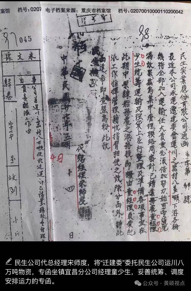 为确保战时抢运任务,民生公司提前派出年富力强、经验丰富,时任业务处经理的童少生坐镇宜昌,配合交通部次长卢作孚调度船舶、协调运力,承运国民政府军政部兵工署与经济部资源委员会,共同组建的“迁建委员会”运川器材8万吨委托,与总公司保持密切联系。其实早在1937年底,郑东琴、卢作孚便动用关系人脉,分别在自已的家乡永川松溉、合川及北碚动员、调动上百艘木船,开拔万县、奉节,出三峡赴宜昌抢运辙川物资,以弥补行轮运力不足。