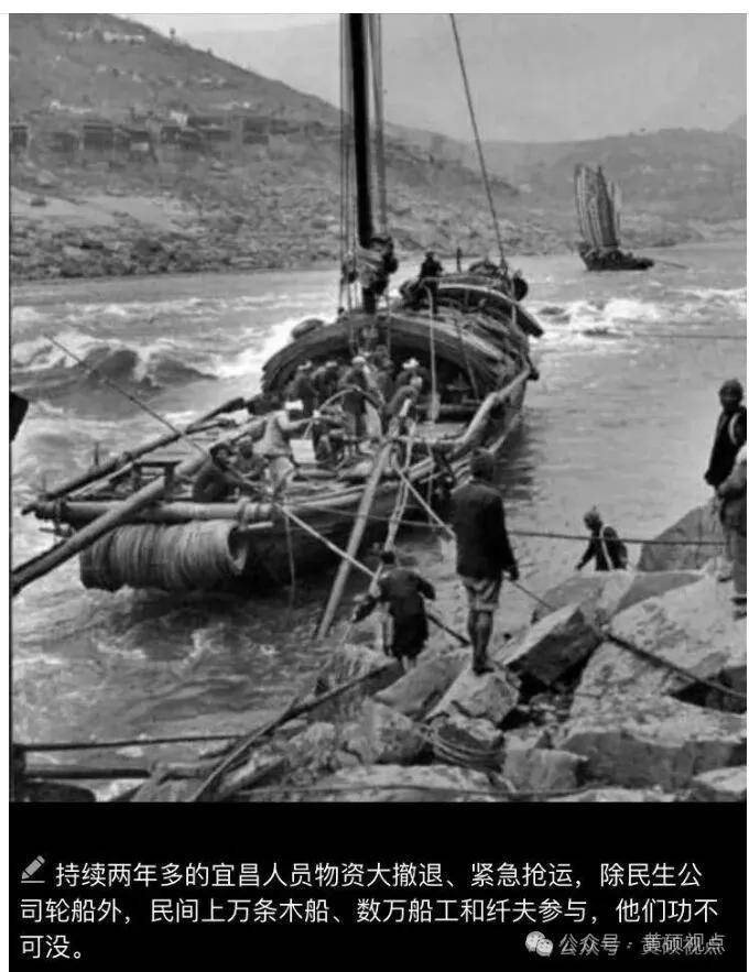 1938年初、武汉、宜昌人员物资向四川、重庆撤退,已经陆续开始,民生公司适合川江航行的轮船有46艘,总吨位大约18700吨,普遍载重量在100―600吨之间。从民间征调的木船普遍载重量在一两吨三五吨至十余吨之间,这样的运力运能构成,这么短暂的时间、恶劣的航道、日机的空袭,能抢运这么多西撤人员、数以万吨计物资、庞大的出川抗战军队,虽然民生公司绝对为主,招商、三北、华强、船帮、纤夫、绞滩站等争分夺秒、配合默契、环环相扣、各施其职、倾尽全力、实在不易。